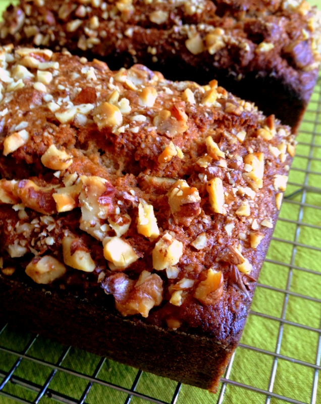 Scrape some of the dry ingredients away from the bottom of the large bowl, then pour the mix of liquids in and combine gently but thoroughly. Divide mixture between the two pans, and stud the tops with the reserved toasted walnuts. Place on a rack in the center of the preheated oven. Bake until breads are golden brown and test done, about one hour. (Tops will resist slightly to gentle finger pressure; sides will have separated slightly from the pan.)