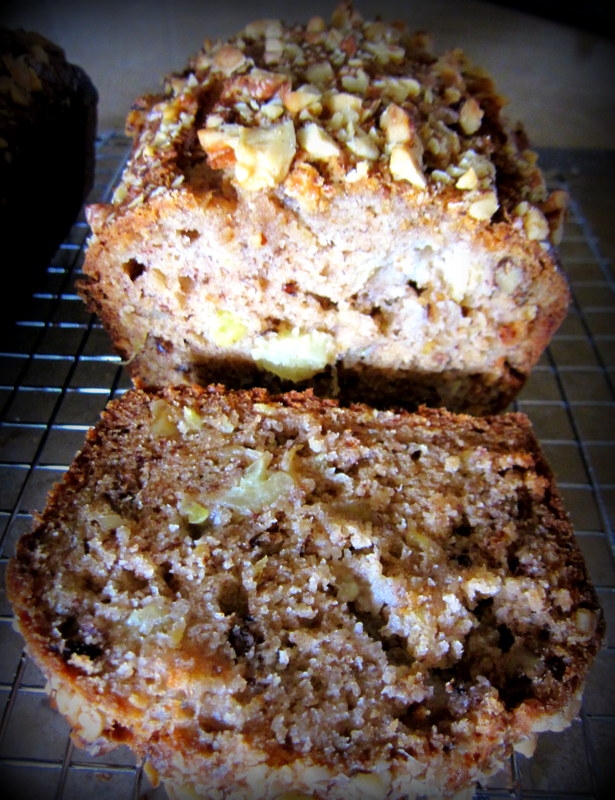 This recipe is adapted from a local community cookbook, Rave Reviews by the Junior League of North Little Rock (© 1982). Banana bread recipes are everywhere, but this one has crushed pineapple in it, and that makes it sing. I reduce the fat by substituting a single-serving package of unsweetened applesauce (the kind meant for lunch boxes) for some of the oil. You can be even more virtuous by adding a half cup of white whole wheat flour (King Arthur Flour makes it; your grocer probably sells it) and reducing the all-purpose flour by the same amount, if you want to up the fiber count.