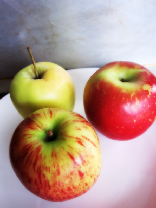 No bonnet, pinafore, or gingham apron is necessary to make these throwbacks to an earlier age. They are an easy dessert that cooks while dinner is being enjoyed, with extras made specifically with breakfast in mind. My favorite apple to use this way is the Rome cooking apple. If you find some, snap them up for this dish. I had no luck finding Romes this year, so I held my own apple pageant, baking three different varieties also known to hold their shape after cooking: Golden Delicious, Fuji, and Jonagold.  Golden Delicious won for taste and looks, with Jonagold first runner-up (delicious but a hot mess under fire). Fuji was too stiff in the interview.