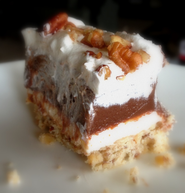 Possum Pie is about to enjoy a renaissance. It rates a whole chapter in Arkansas Pie, an immensely readable dissertation on restaurant pies in Arkansas written by Kat Robinson (tiedyetravels.com), published recently by American Palate. My friend S asked me if I’d ever tried it, but I didn’t recognize it by that name. Possum Pie is known by a lot of other monikers in Arkansas, three alone in my mother’s wooden recipe box: Four-Layer Pie, Striped Delight, and Chocolate Layer Pie. I remember loving it when my mother made it, but when I found the recipe for Ashley’s Four-Layered Dessert in Naomi’s Home Companion, by Naomi Judd, that was it, and not just because Ashley Judd is one of my favorite actors. Naomi’s became the go-to version, primarily because the chocolate pudding in the center is made from scratch. Believe me, the richness of genuine chocolate flavor simply puts pudding mix to shame. You’ll never miss the disodium phosphate, I promise. (Besides, I add somewhat sheepishly, the recipe has gobs of Cool Whip in it. Go ahead, make fun. It’s delicious.)