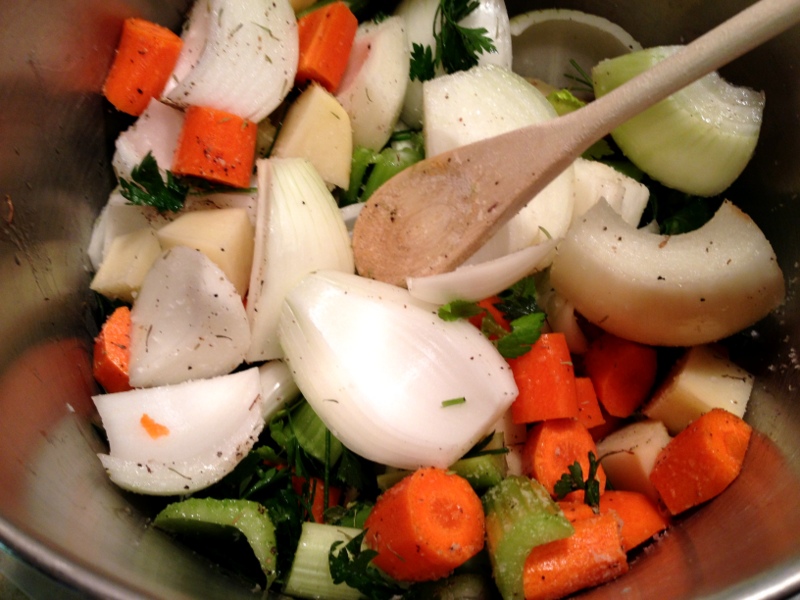 1. Peel the vegetables. Cube the potatoes, quarter the onions, slice the carrots and celery into chunks, and coarsely chop the garlic and parsley. (I include the parsley stems, too.) Measure in cups the amount of prepared vegetables (usually about 10 cups), and use the same amount of water.