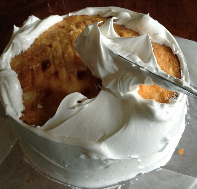 The cake layers are baked, and the first swirls of White Mountain Frosting are applied.