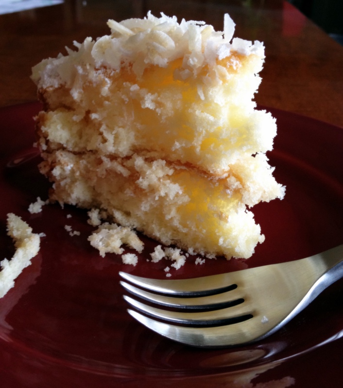 The first ingredient listed in the recipe for Fresh Coconut Cake from The Fannie Farmer Baking Book is (ta dah!) one coconut. Author Marion Cunningham instructs the cook to access the meat of the coconut by doing as monkeys do: flinging it onto a concrete or rock surface. It’s an effective technique, both as a means of breaking open the coconut after several hard throws, and in making the cook look like a deranged primate to any neighbors who happen to observe from their windows on, say, Easter Sunday.