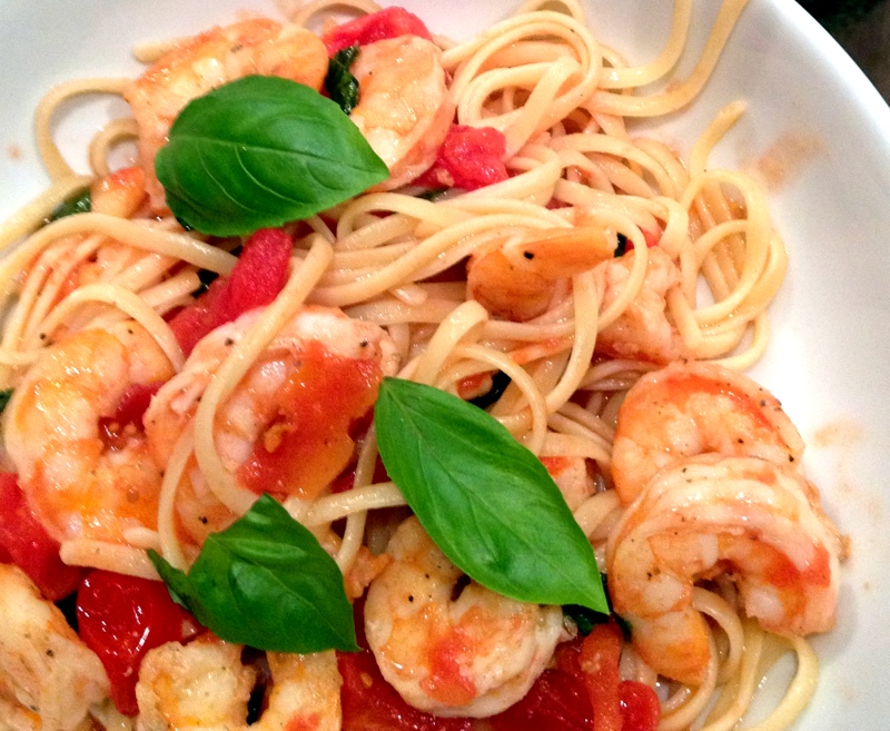Shrimp and Basil Pasta (slightly adapted from Great Food Fast, from Everyday Food magazine and the kitchens of Martha Stewart Living, © 2007 by Martha Stewart Living Omnimedia, Inc. Published by Clarkson Potter/Publishers, New York)