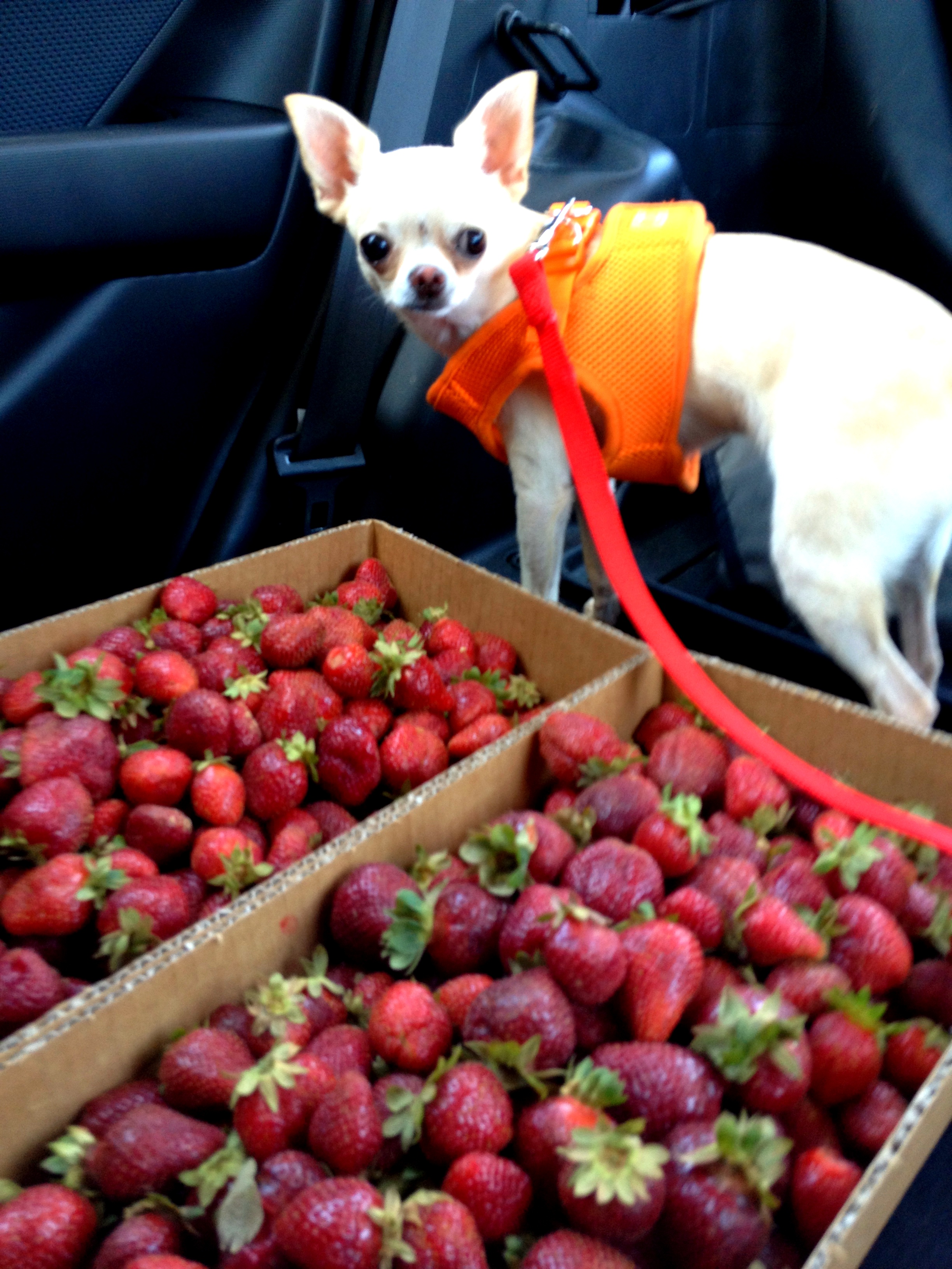 Exposed as I was as a citified fraud, possibly to be ejected for ignorance from the lines of people allowed to buy his fruit, I nodded and smiled and acknowledged my humble status as a tourist in the land of strawberry farming. Thus mollified, with a twinkle in his eye that suggested he unleashed his best crusty attitude for the amusement of his helpers, the farmer sold me $30-worth of berries which he amiably carried to my car, since my hands were full of chihuahua. Bruiser had accompanied me on this trip, and he was eyeing the farmer with growing annoyance.