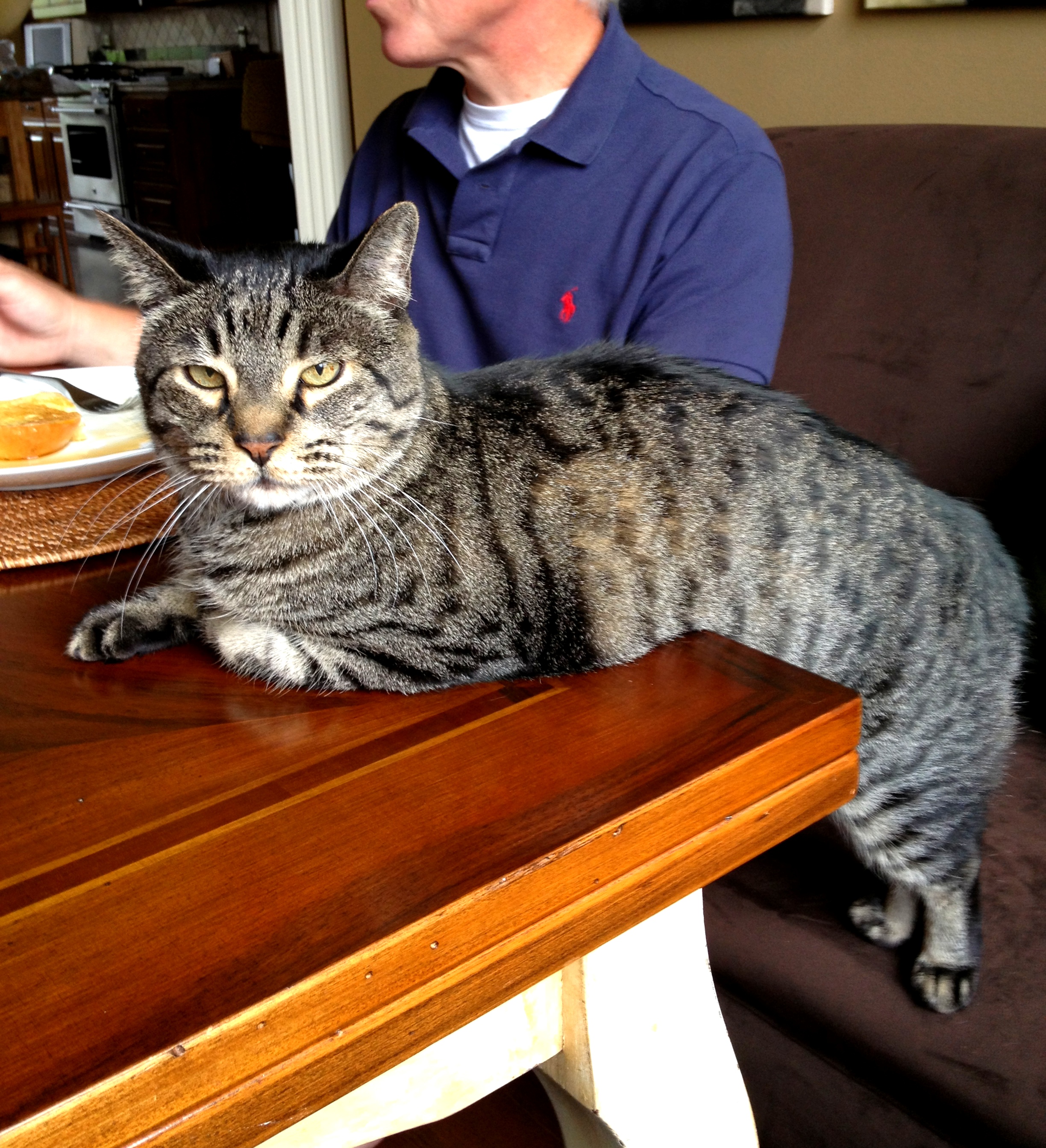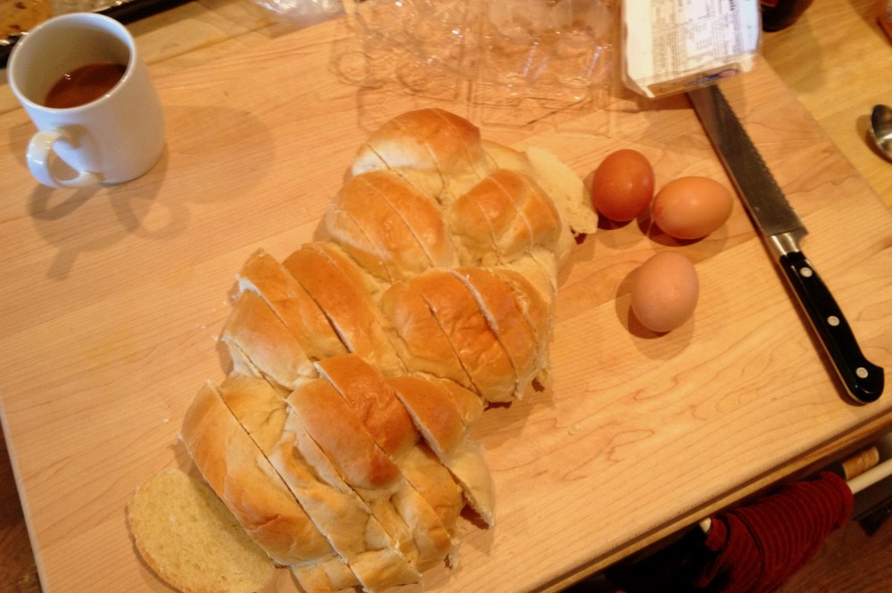 Bo claimed his spot at the table a few months ago. He’s there for the conversation, since his own kibble is served in the laundry room. Most mealtimes, he beats the rest of us there, taking up his position just before plates get filled. This was last Sunday, Father’s Day, and we had french toast made with challah for a late breakfast.