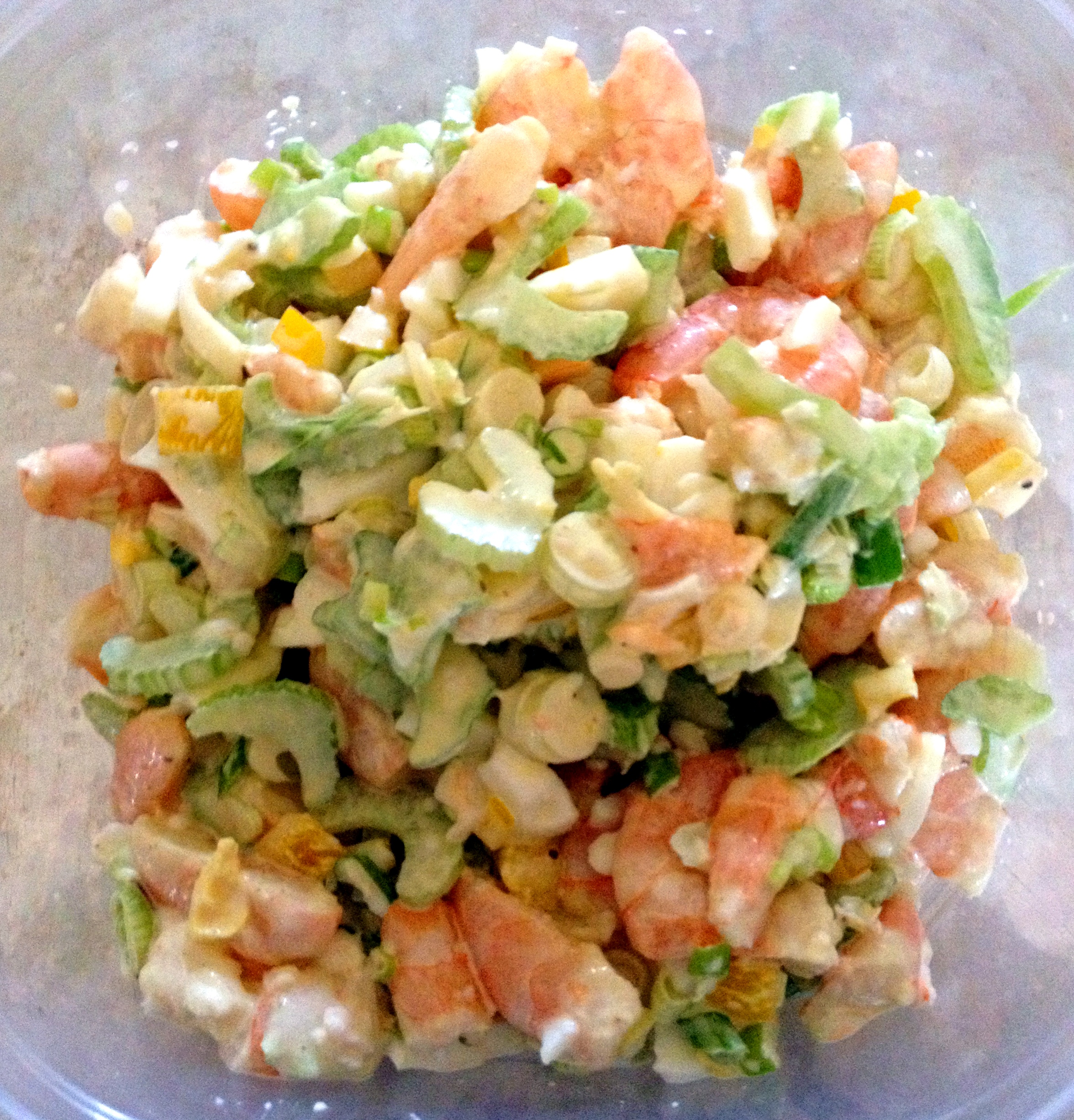 The salad itself was simple. Because I was cooking for a crowd, I bought 6 pounds of frozen cooked, peeled shrimp at my local warehouse store. I had read a tip on page 389 of Southern Living’s 1001 Ways to Cook Southern (© 2010 by Oxmoor House Inc.), which recommended a brief bath in seasoned boiling water followed by a plunge into ice water to improve the texture of pre-cooked shrimp. I’m here to say, DON’T DO IT. I did a test-run with a pound of shrimp, and after two minutes in the boiling water, the shrimp shrank by at least 50 percent. That’s not only hard to say, it’s bad news when you have a lot of people to feed. Even worse, the shrimps’ texture was not improved, and flavor was nonexistent.