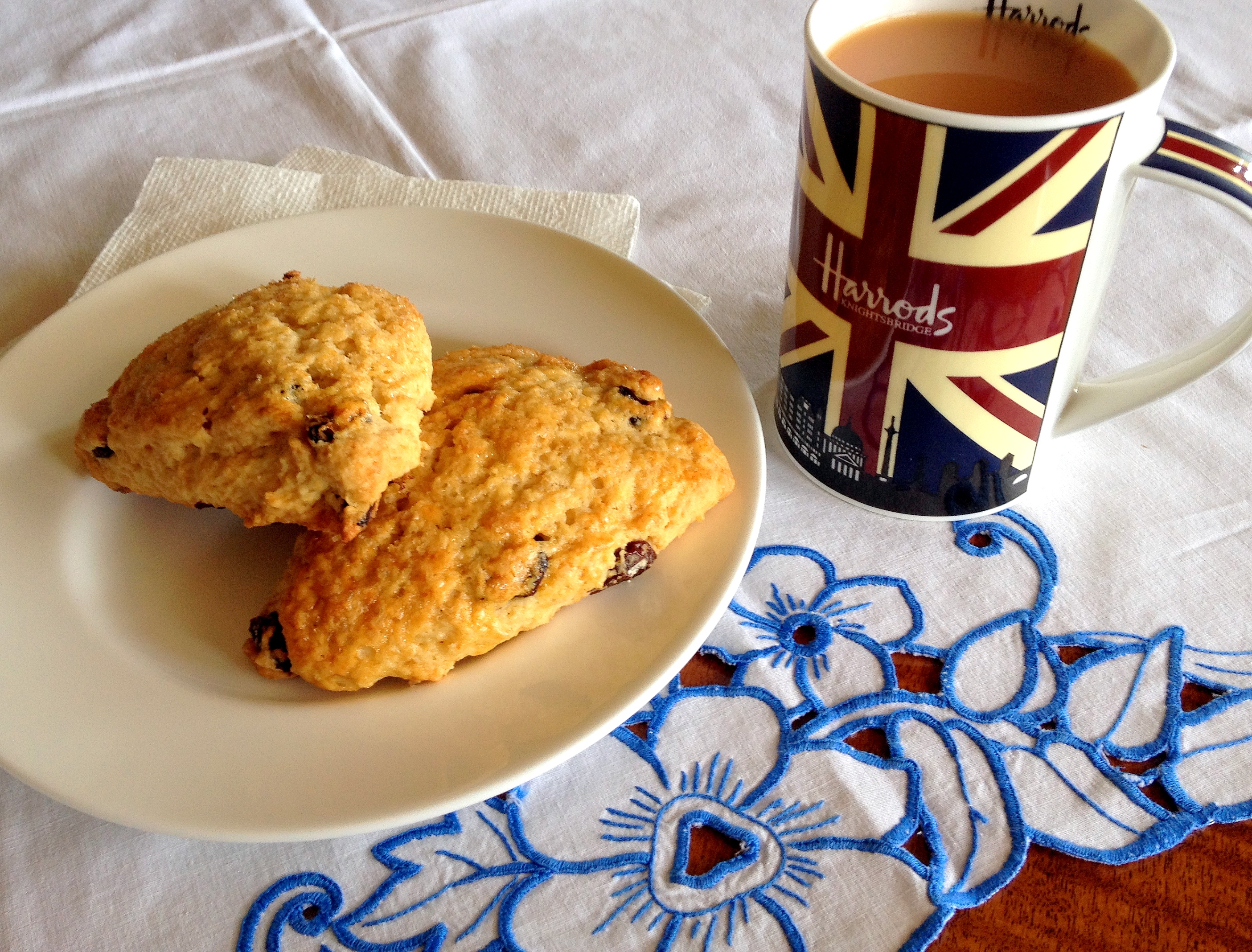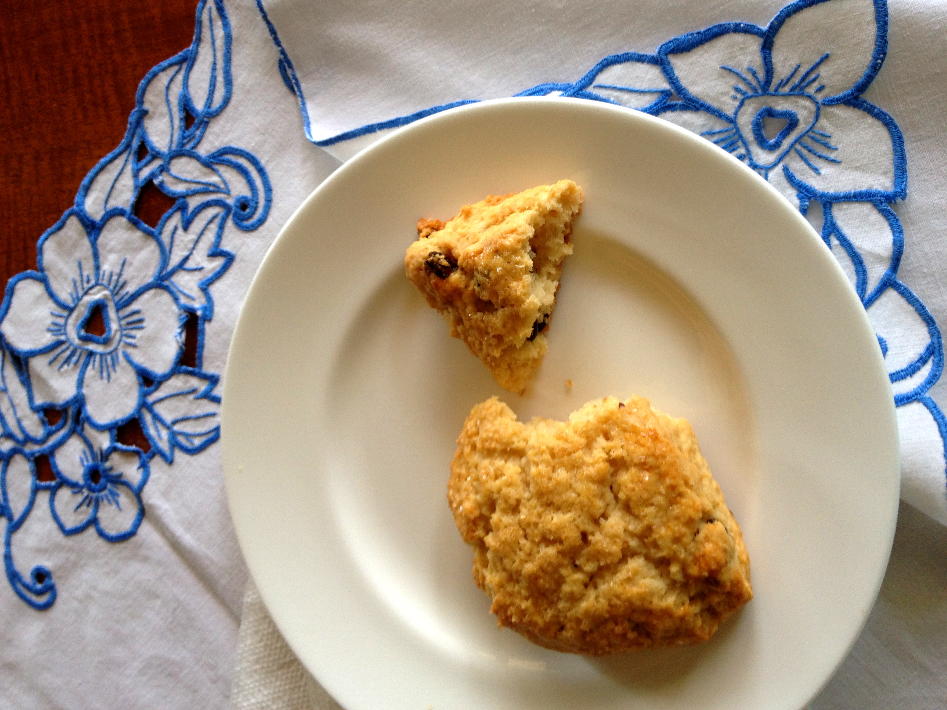 A cherry scone, with tablecloth embroidered by my British Aunt B.