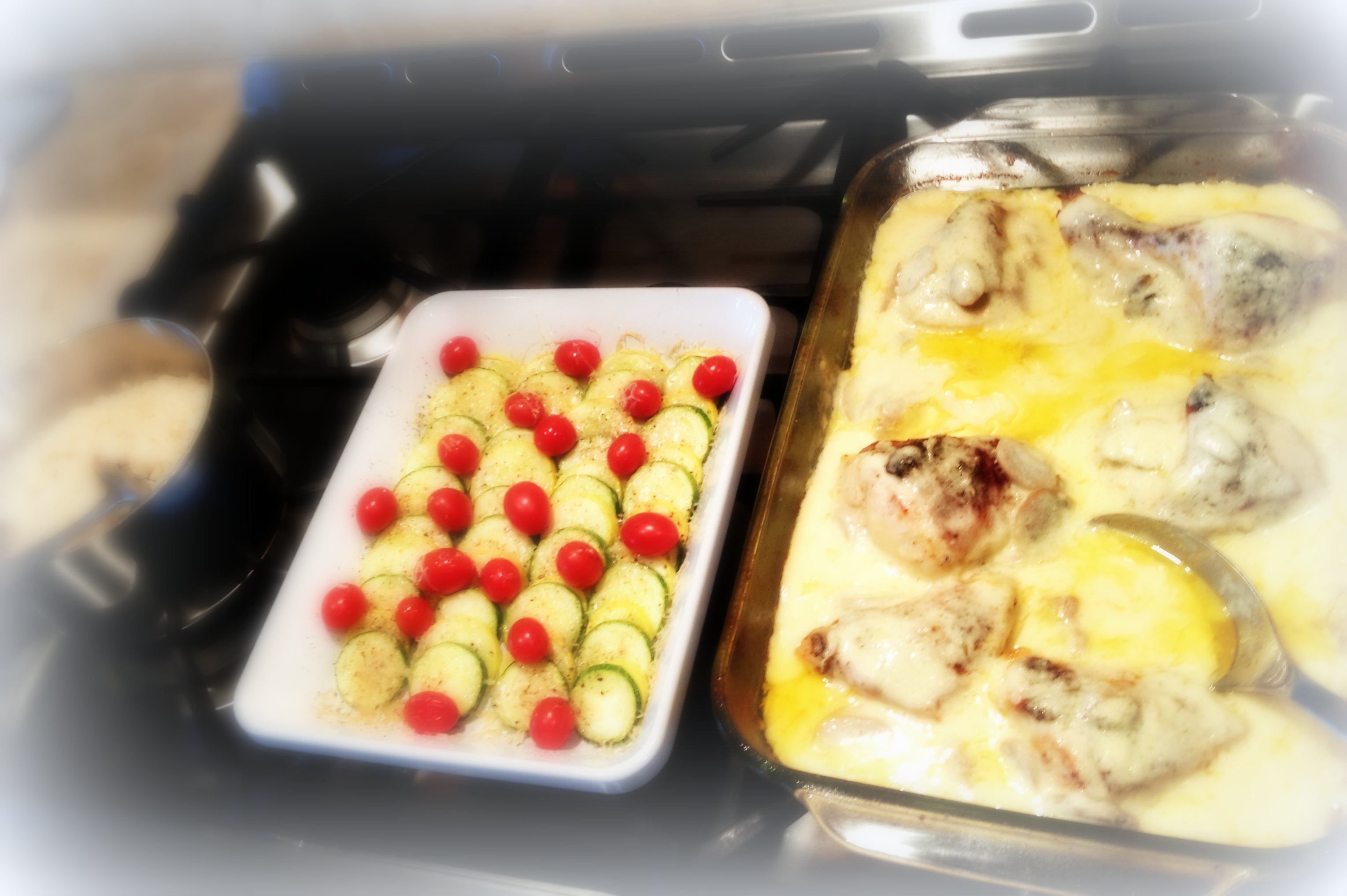 Layer (aka, “shingle”) alternating colors of squash and zucchini slices in rows down the length of the dish. Scatter 2 handfuls of grape tomatoes on top, if you want to. Drizzle with 1 Tablespoon olive oil, then sprinkle over 1/4 cup grated Parmesan cheese. Season with salt and pepper to taste.