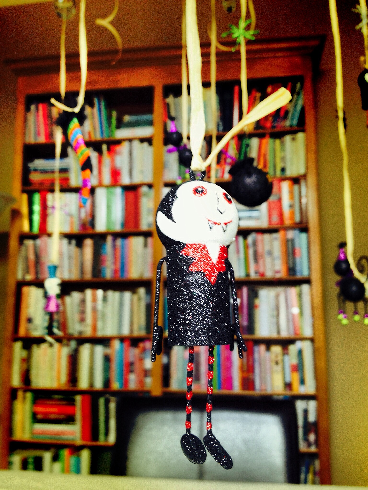 Sparkly vampires, skeletons, cauldrons, and black cats levitating over my dining table. (Ignore the raffia strings.)
