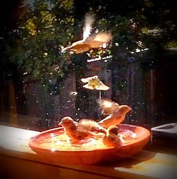 Birds splashing in an improvised bath (an oversized clay saucer).