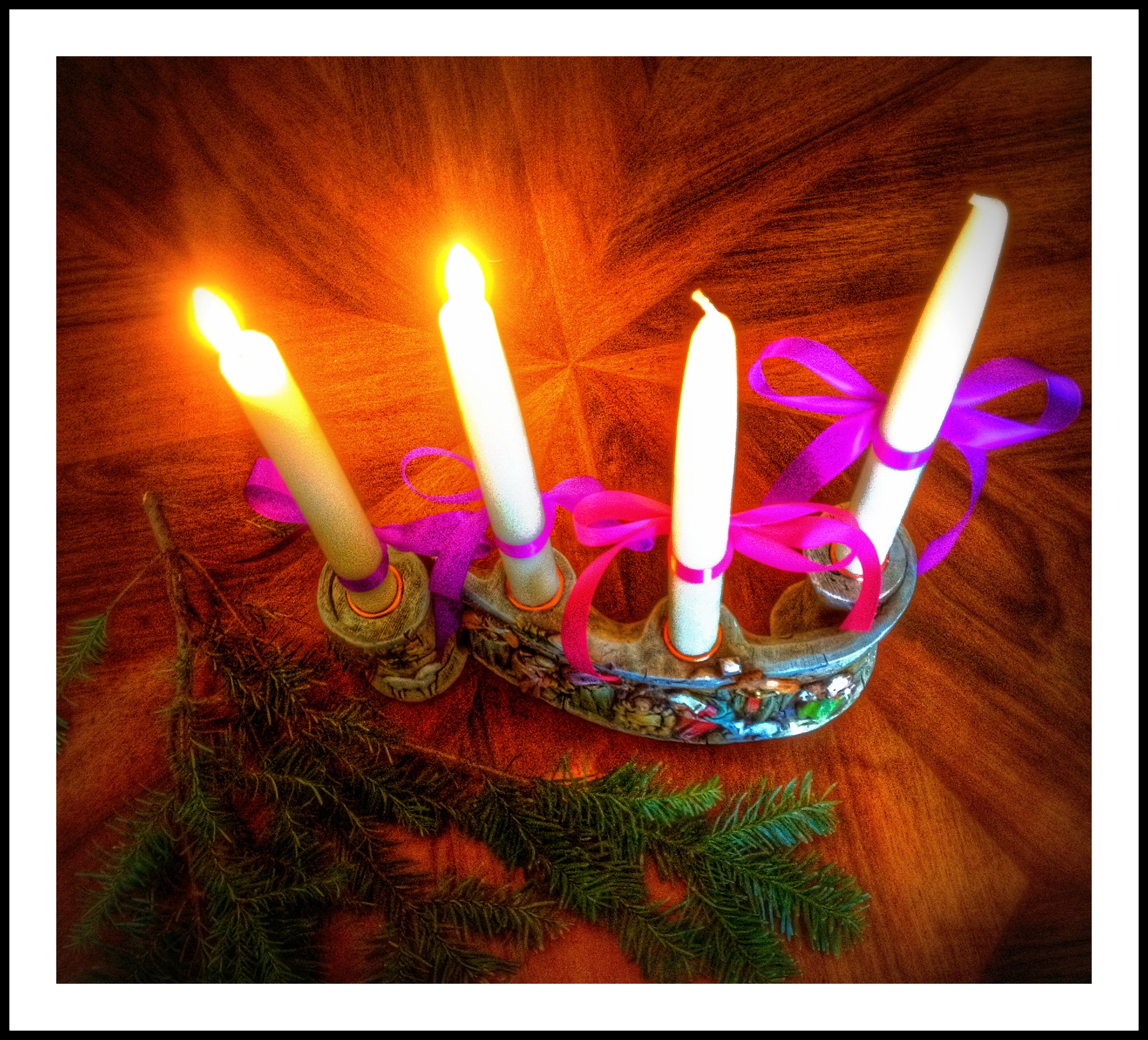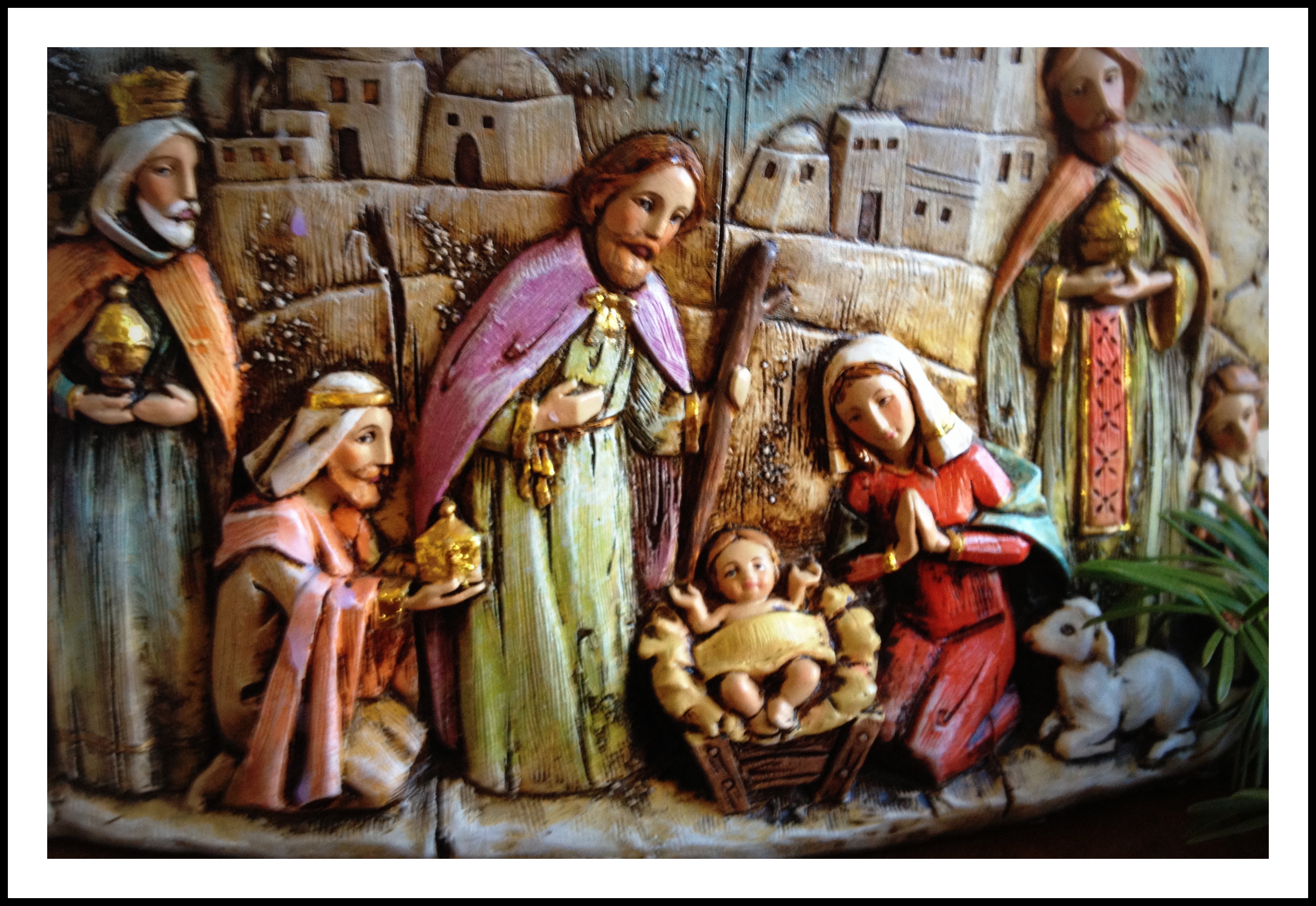 My family’s Advent candle holder features a nativity on the front. I like it a lot, even though I had to color in Joseph and Mary’s hair with a furniture scratch-cover pen to darken their original blond tresses.