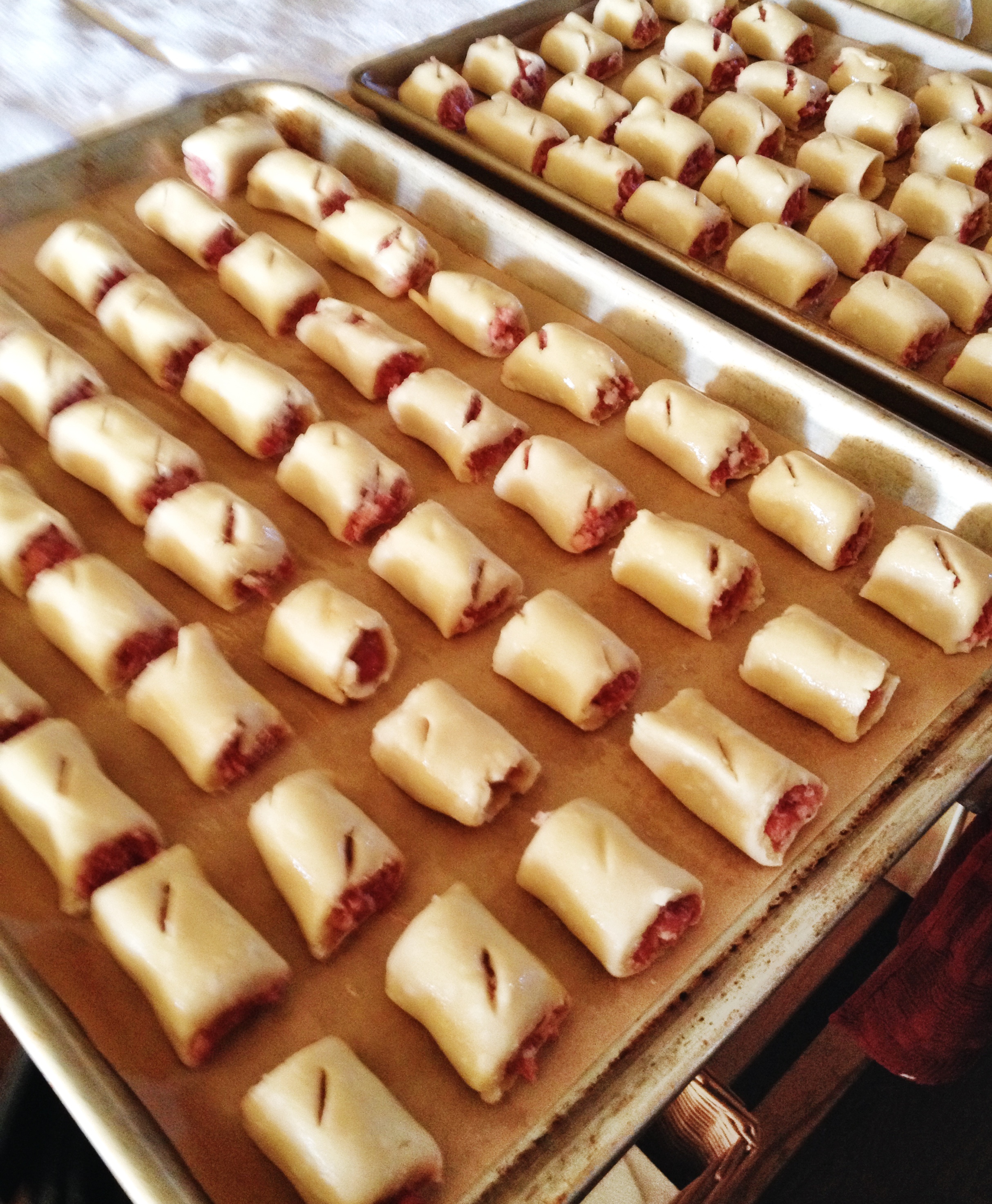 (At this point, the sausage rolls can be covered with plastic wrap and refrigerated a day or two before baking. As if anyone plans ahead like that.)