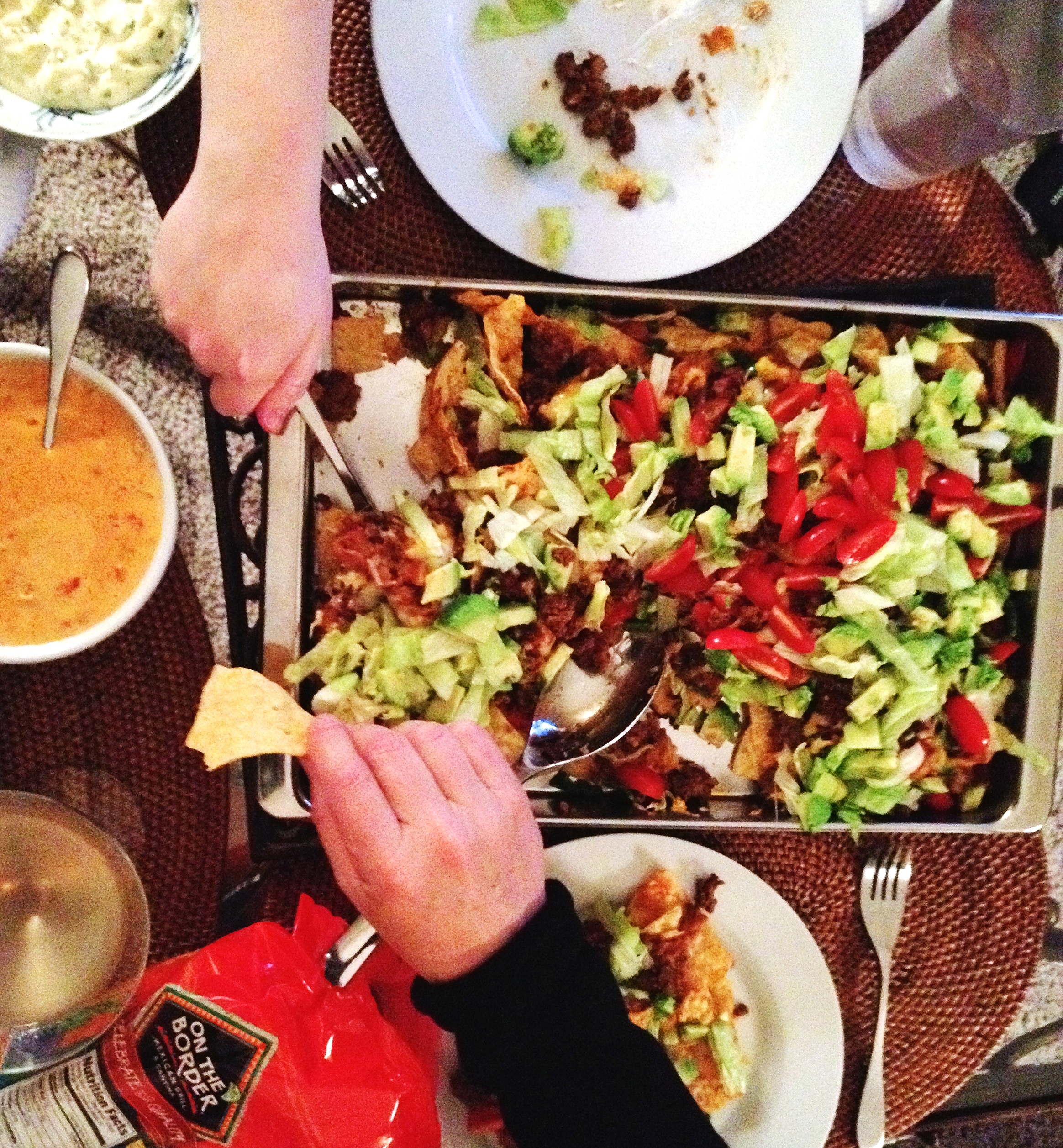 Tortilla chips, preferably the sturdy kind that won’t shatter under the weight of refried beans and taco meat. For this purpose, I like the On The Border brand.