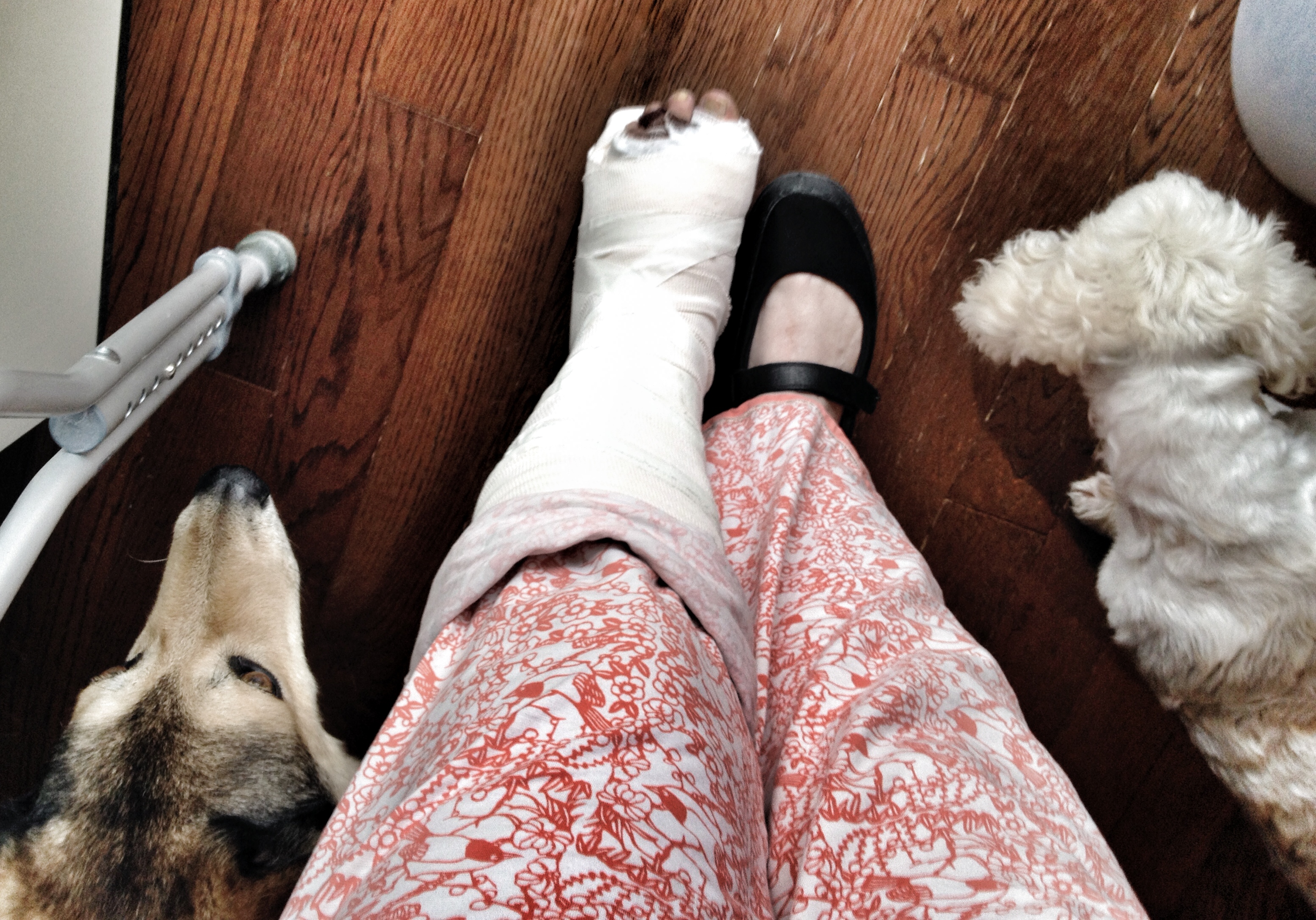 My doctor had me sign a promise not to be alone for the first 24 hours after surgery, because stuff happens. Things bleed. People fall. Stitches pop. Anesthesia fogs the brain. I signed, but I would have considered a pinky swear more binding. As it happened, once my husband got me ensconced at home on a pile of pillows, he got called away to an emergency legal hearing. Feeling fine and competent, I asked my daughter, who had taken the day off from work, to run an errand for her grandfather. Later, full of misplaced confidence, I tried to navigate a trip to the bathroom alone. The odd movement I sensed peripherally under my gimpy foot made no sense to my addled brain. It turned out to be a spreading puddle of blood on the bathroom tile, coursing from the open toe of my cast like red milk from a carton. I tipped my foot up to stem the flow and considered my options. Bleeding to death didn’t seem likely, but passing out was a possibility. There were four dogs in the house, and I wasn’t sure I could depend on them to behave well under the circumstances. Eventually I called my husband and asked him to return home if at all possible. The emergency number provided by my doctor’s office connected me to a nurse who asked a few questions and assured me everything was fine. Should I get the wrap changed, I asked her; this one’s pretty soaked. No, she said, the doctor prefers to keep surgical dressings in place until we see you in three weeks. Someone will change it then. Okay, I said. Yuck, I thought. I’m buying a nice box of chocolates for the poor nurse who gets that job.