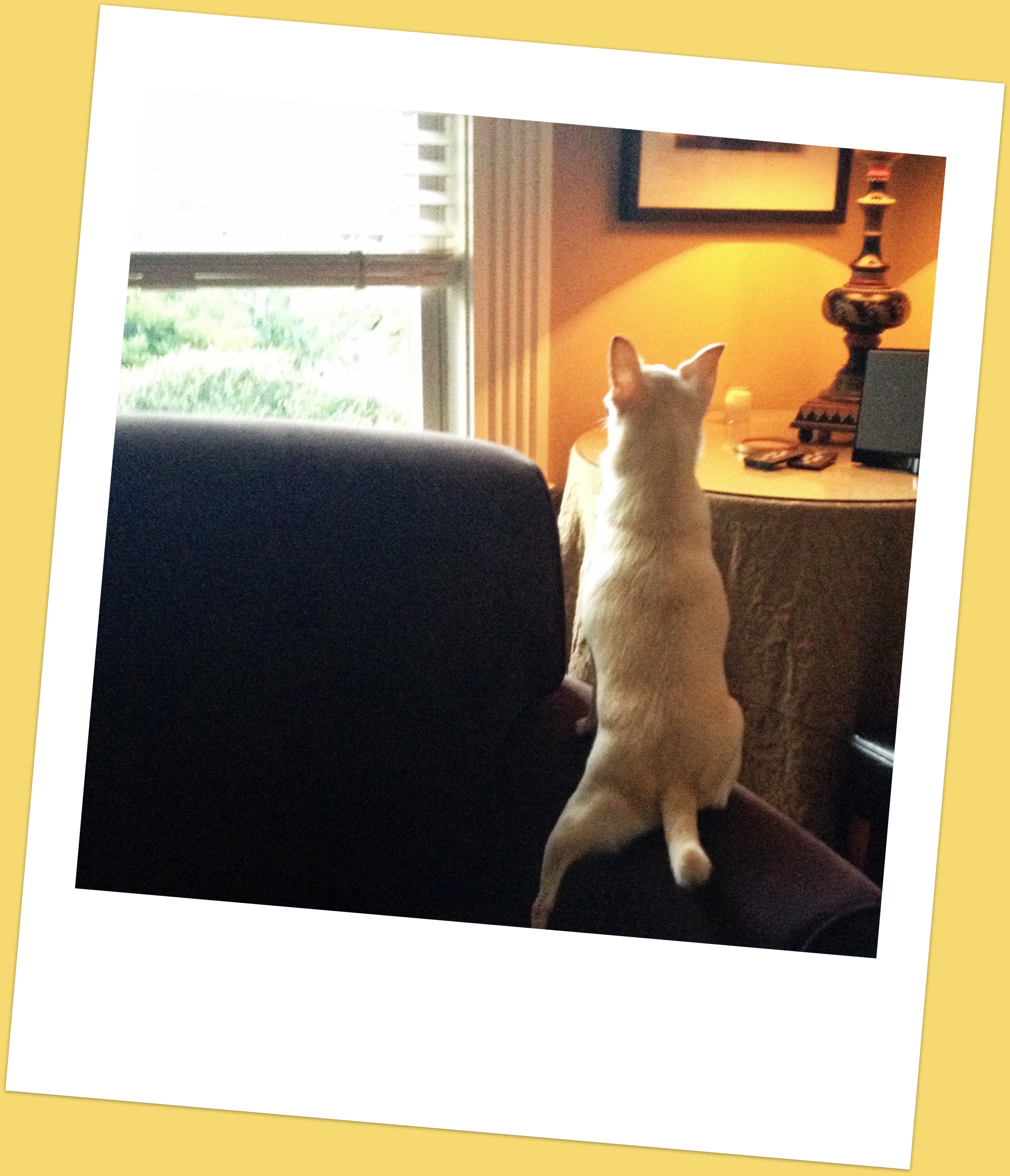 This clock-reading, crazy Chihuahua. Around 5:10 p.m. each weekday, he takes up a post on a sofa in my dining room, where he has a good view of the street, and begins his vigil. Because he knows SHE will arrive soon to pick him up, and SHE is his everything.
