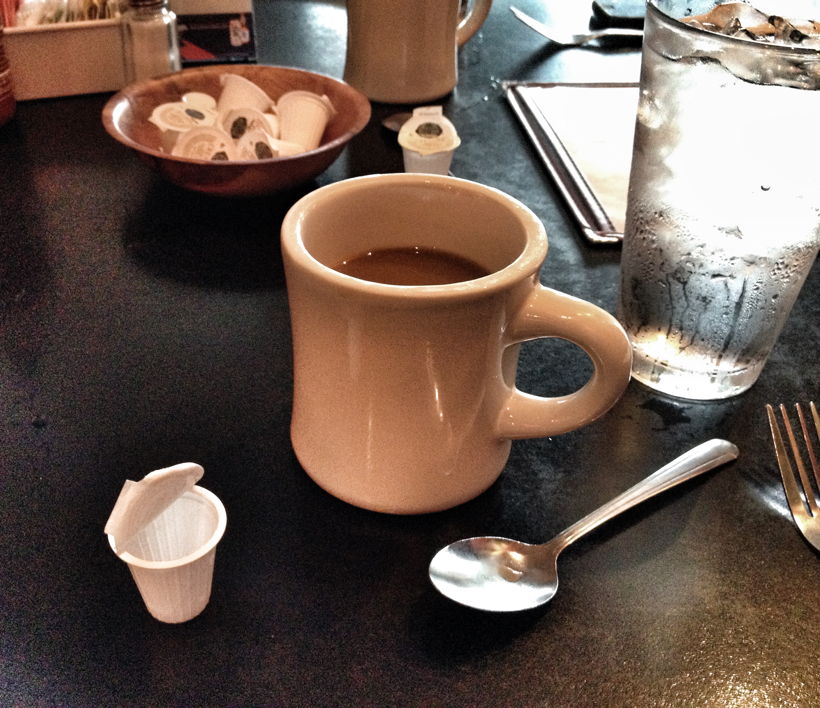 Breakfast out at a place with diner mugs, plenty of cream, and a bottomless pot.