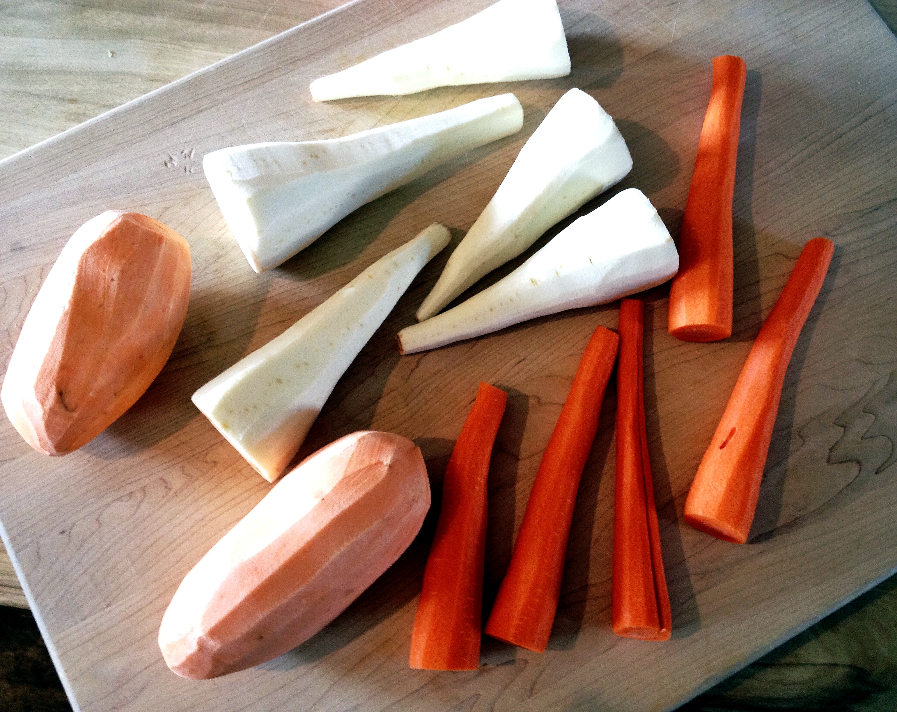 These carrots, parsnips, and sweet potatoes were peeled and cut before being glazed with olive oil, honey, and autumnal spices. Here’s a link to that recipe, which originally ran in The Washington Post, followed by an appearance in the Arkansas Democrat-Gazette‘s food section right before Halloween. The mix of cumin, coriander, ginger, cinnamon, and cayenne filled the house with a wonderful fragrance as the root vegetables roasted.