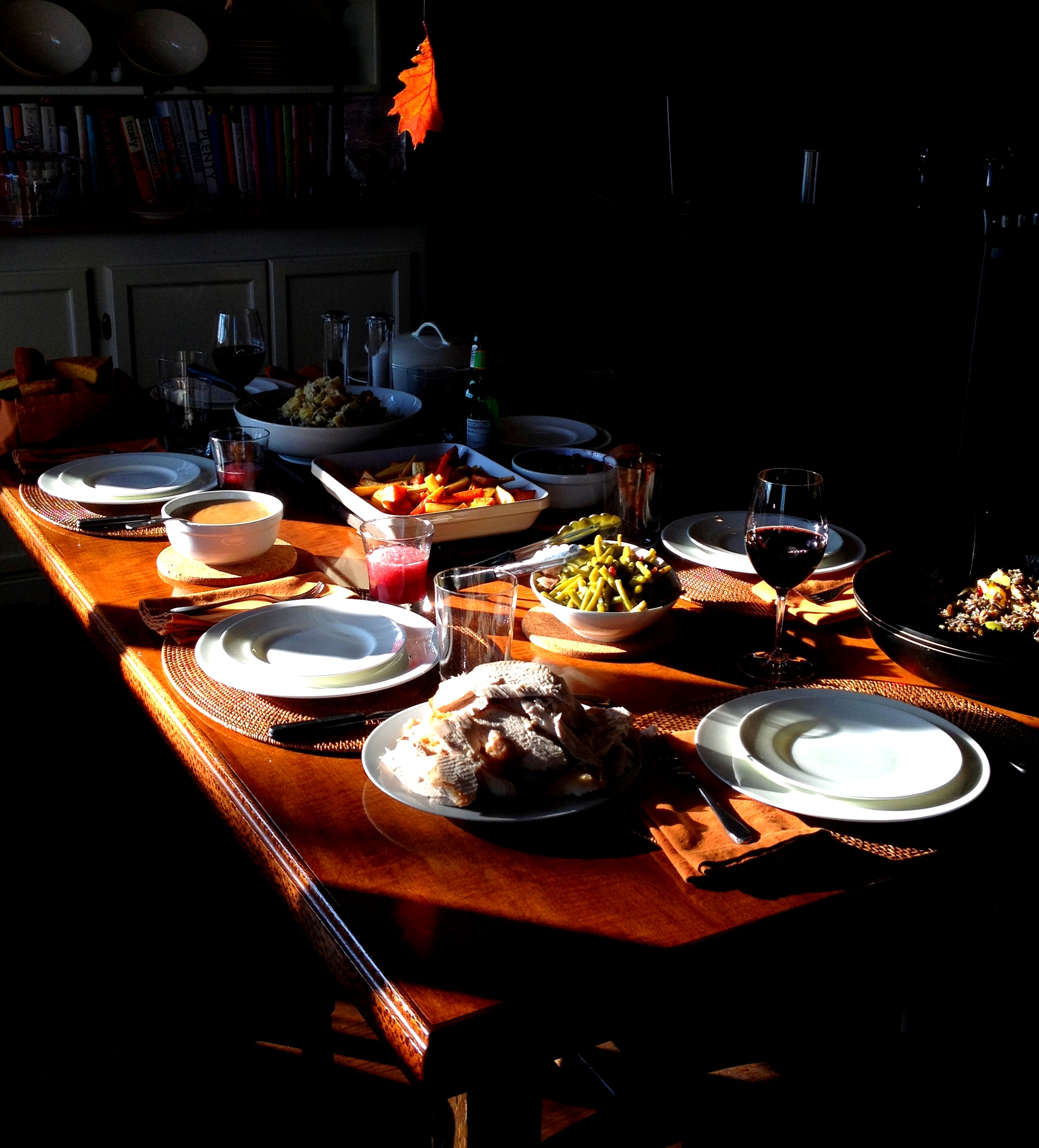 I like serving family-style, with all the food on the dining table. Makes it easier to reach for seconds, and the feeling of conviviality among diners is nice. Doesn’t leave much room for table decorations, however, especially on Thanksgiving, so this year we went vertical, with a cascade of scarlet and yellow leaves coming down from the ceiling. I had a leaf prop master (aka, First born’s boyfriend) engineer the look with fishing line, clear push pins, leaves from a morning hike up Pinnacle Mountain, and a six-foot-ladder perched atop the dining table. The effect was lovely, especially when the colorful leaves turned slowly in the air.