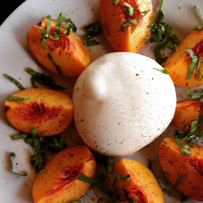 Got some fine sea salt, freshly ground black pepper, and good olive oil handy? Excellent. Apply judicious amounts of all of those things over the cheese and the peach quarters. Sprinkle ribbons of basil over just the peaches.