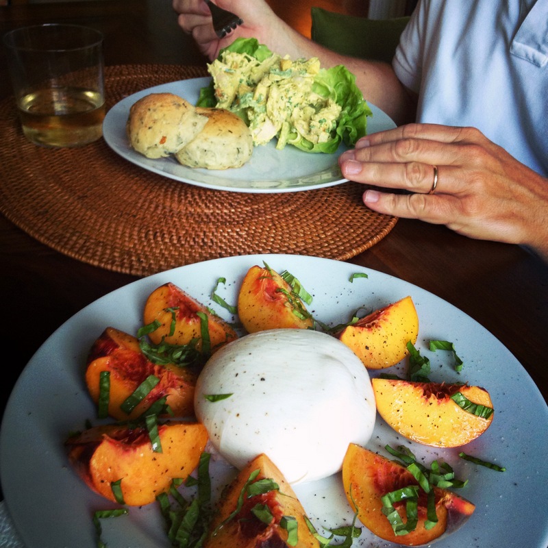 Cool dinner on a hot night: Peach Caprese Salad and Coronation Chicken. Handsome hand model: my husband.