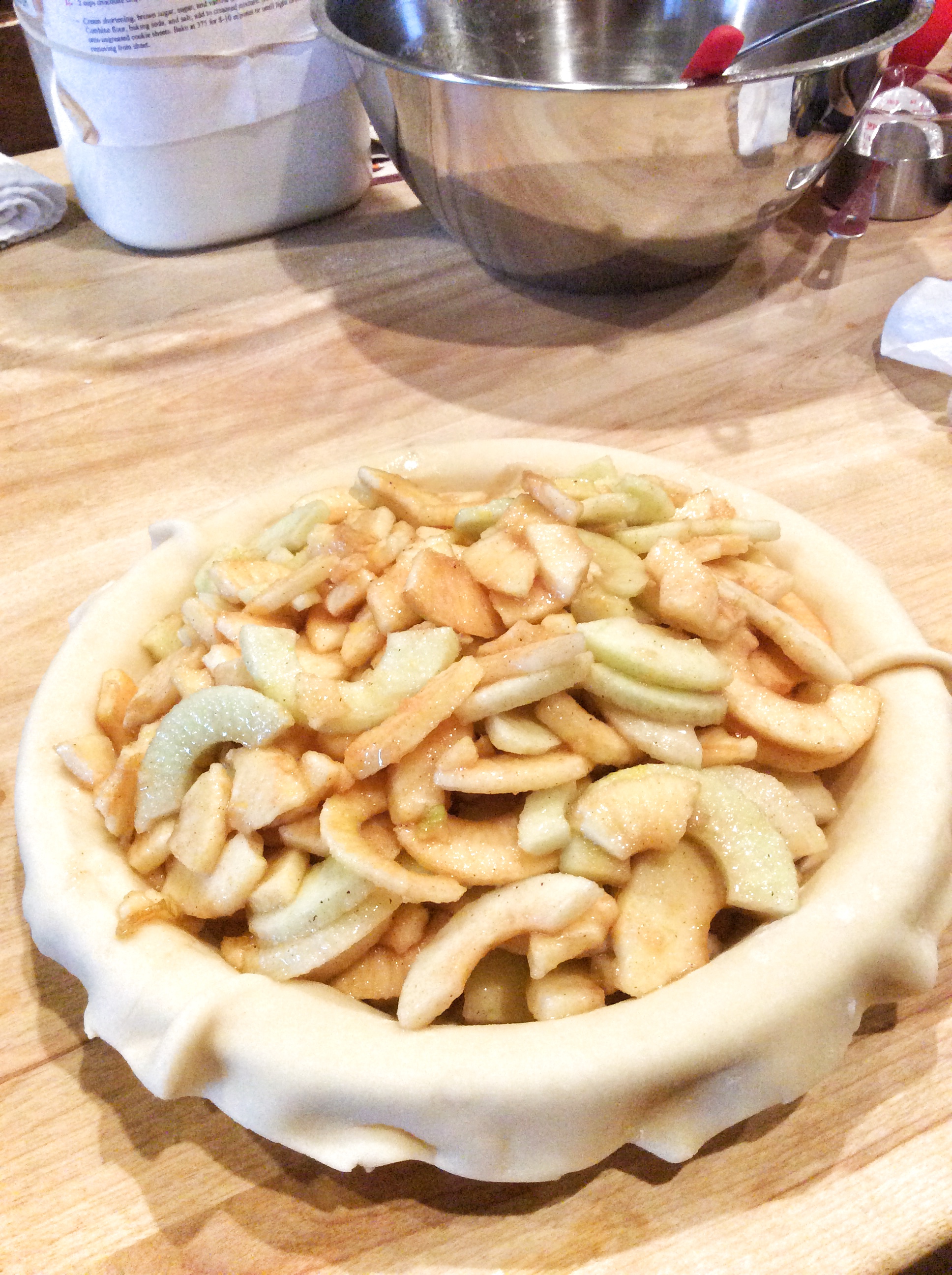 Filling made with 1 1/2 pounds Granny Smith apples and 2 pounds Golden Delicious apples, prepared according to the recipe in The America’s Test Kitchen Family Cookbook, by the editors at America’s Test Kitchen at Brookline, MA. Published in 2005.