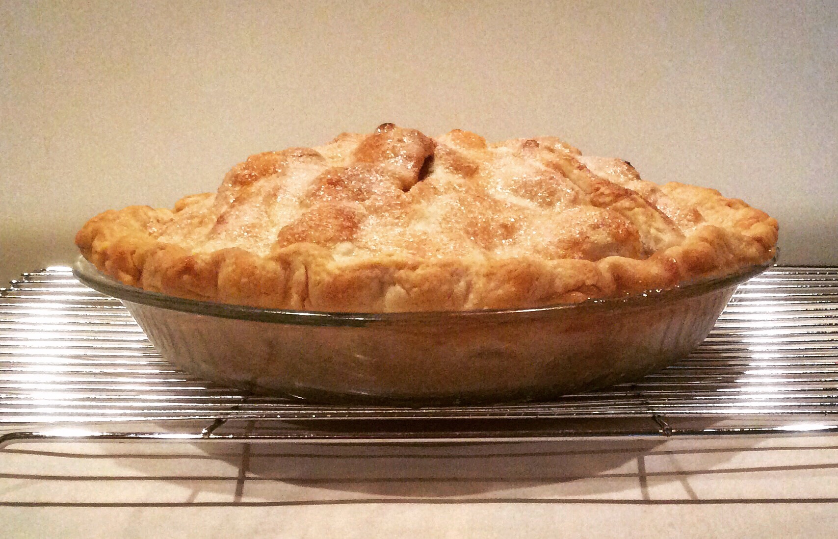 To make the pastry (directions adapted to my baking preferences): In a food processor fitted with a knife blade, whiz together 2 1/4 cups (10.15 oz) all-purpose flour and 1/2 teaspoon table salt. Add 3/4 cup (6 oz) vegetable shortening, cut into small chunks, and pulse several times, until the shortening is evenly distributed and the mixture looks like small pebbles. Pour 7 tablespoons cold water over all, and pulse again several times, just until the pastry forms a cohesive mass. Don’t overprocess, or the dough will be tough. Divide the dough in half, shape into flat discs, and wrap in sheets of waxed paper. Chill dough in the fridge for 30 minutes. (This step is critical for ease in rolling.) Roll out on a floured surface with a lightly floured rolling pin. Line a pie pan with one part, and use the second as the top crust.