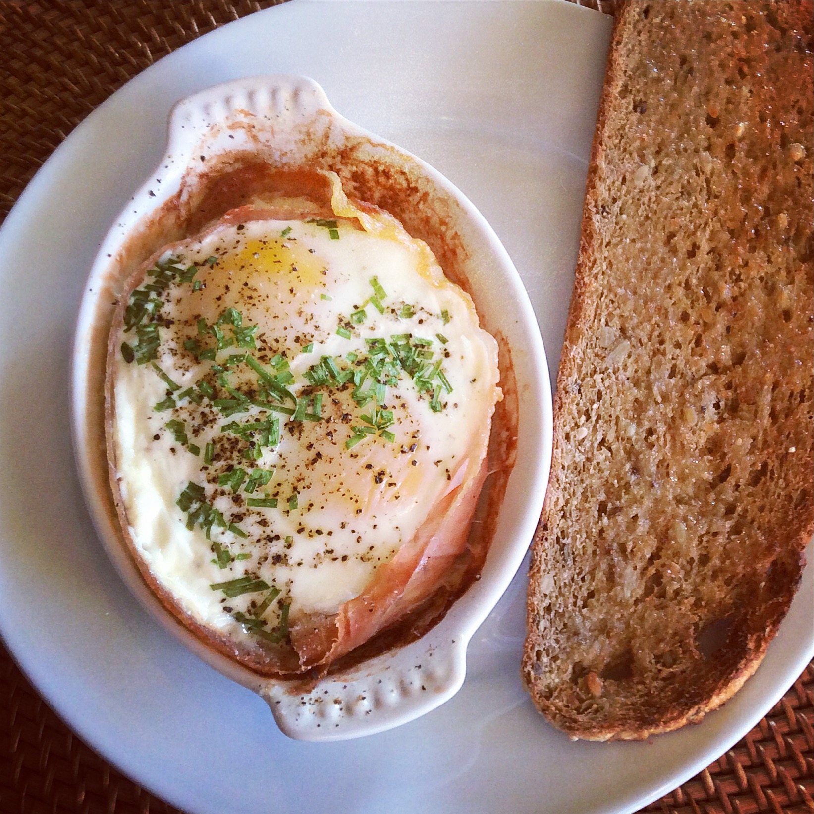They could say the same about you, I replied, as I put a prosciutto-lined ramekin of eggs baked with cream on the placemat in front of him. One for B, and one for me. Freshly cut chives glowed grass-green against the yellow yolks.