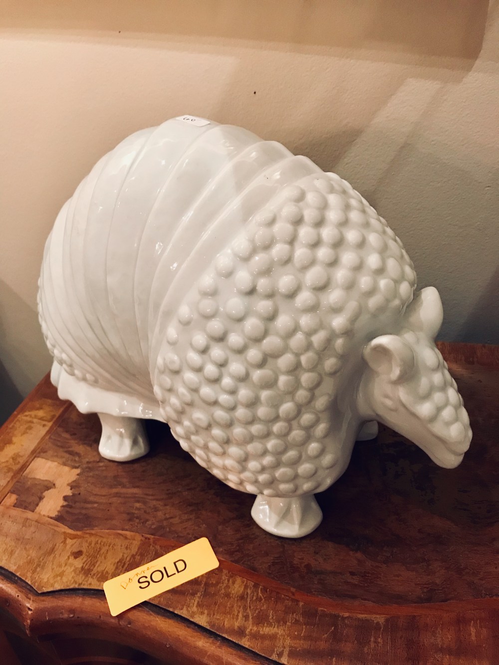 I didn’t buy the life-sized ceramic armadillo, although it would have made a superb wedding present for S and J’s son, purely for the entertainment value in watching the unwrapping. I didn’t buy the copy of Charleston Receipts, either, an old cookbook of great renown. I wanted to like it, but the meats chapter, with its pages of dishes made from calf’s head and beef tongue, put me off. Someone snatched it up right after I put it down.