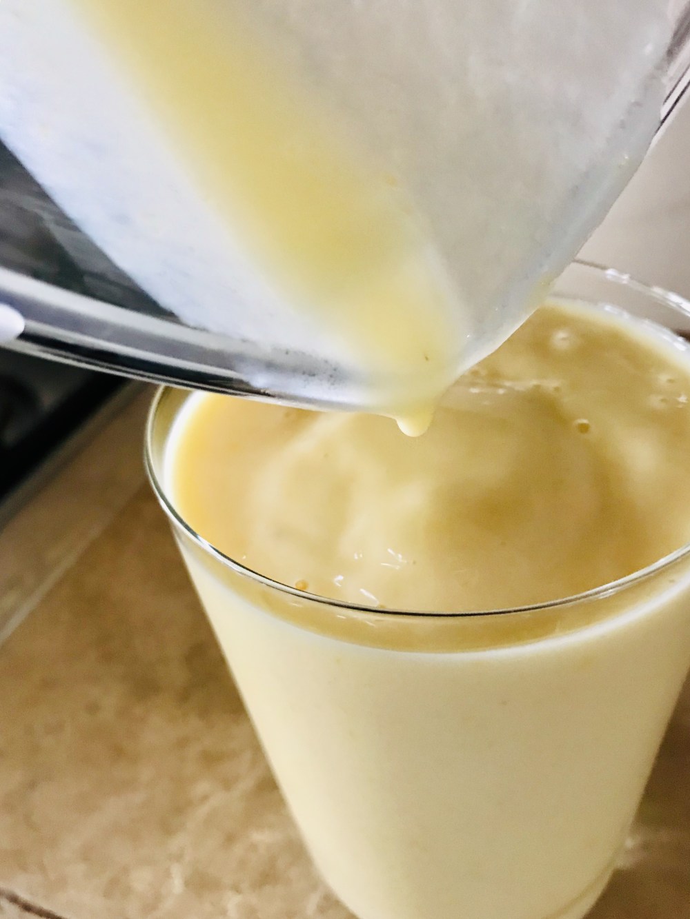 In a blender, combine 1 cup frozen mango chunks, half a ripe banana, 1 cup coconut water, 1/2 cup Greek yogurt (2% fat), and a good squeeze of honey. Purée until smooth. Serve in a tall glass.
