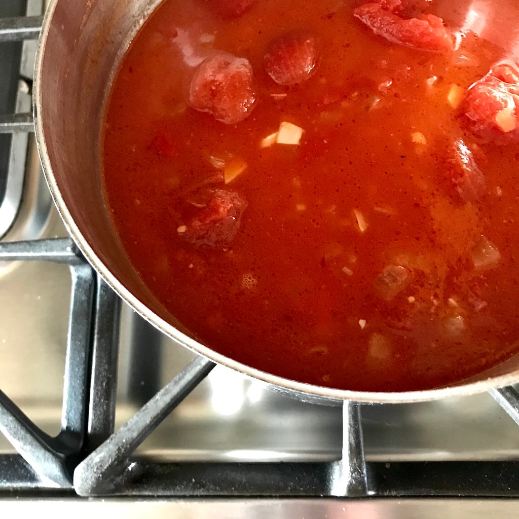 Add 2 28-oz cans of whole peeled tomatoes & 1 cup water or vegetable broth; bring to a boil. Toss in the rind of a chunk of Parmesan cheese. Reduce heat to a simmer, & let soup bubble gently for 30 minutes. (Stir every so often, scraping the bottom of the pan to make sure the cheese rind isn’t sticking to it.) Fish out the Parmesan rind & discard.